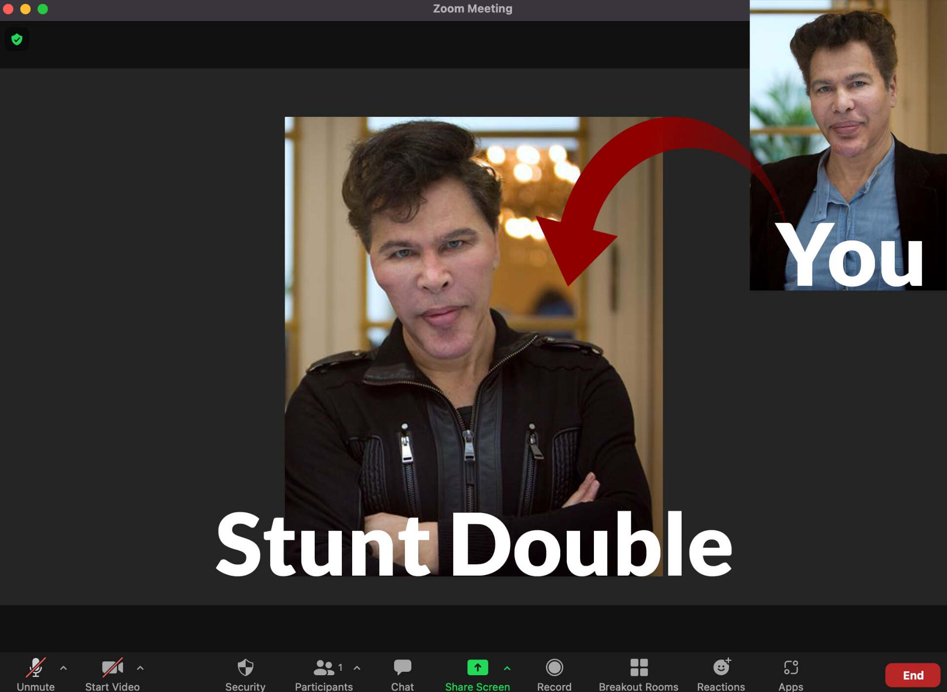 Use ZoomClone to hire a clandestine stunt double to attend your zoom meetings.